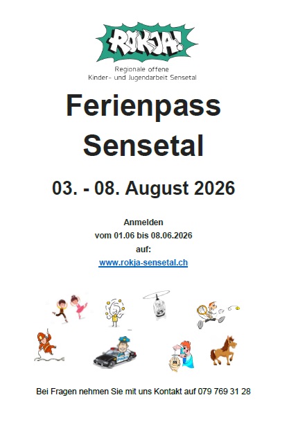 Startseite Aktuelles Sommerferienpass 2026 Sommerferienpass 2026 Wir sind in der Vorbereitung für den Sommerferienpass der ROKJA mit über 40 unterschiedlichen Angeboten in der Region Sensetal. 29. März 2026 Kontakt Regionale offene Kinder- und Jugendarbeit Sensetal - ROKJALaupenstrasse 313176 Neuenegg Mo / Mi / Do / Fr Neuenegg: 079 769 31 28 Inhalt